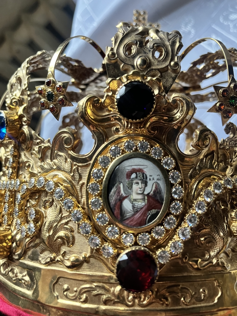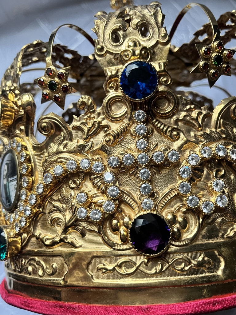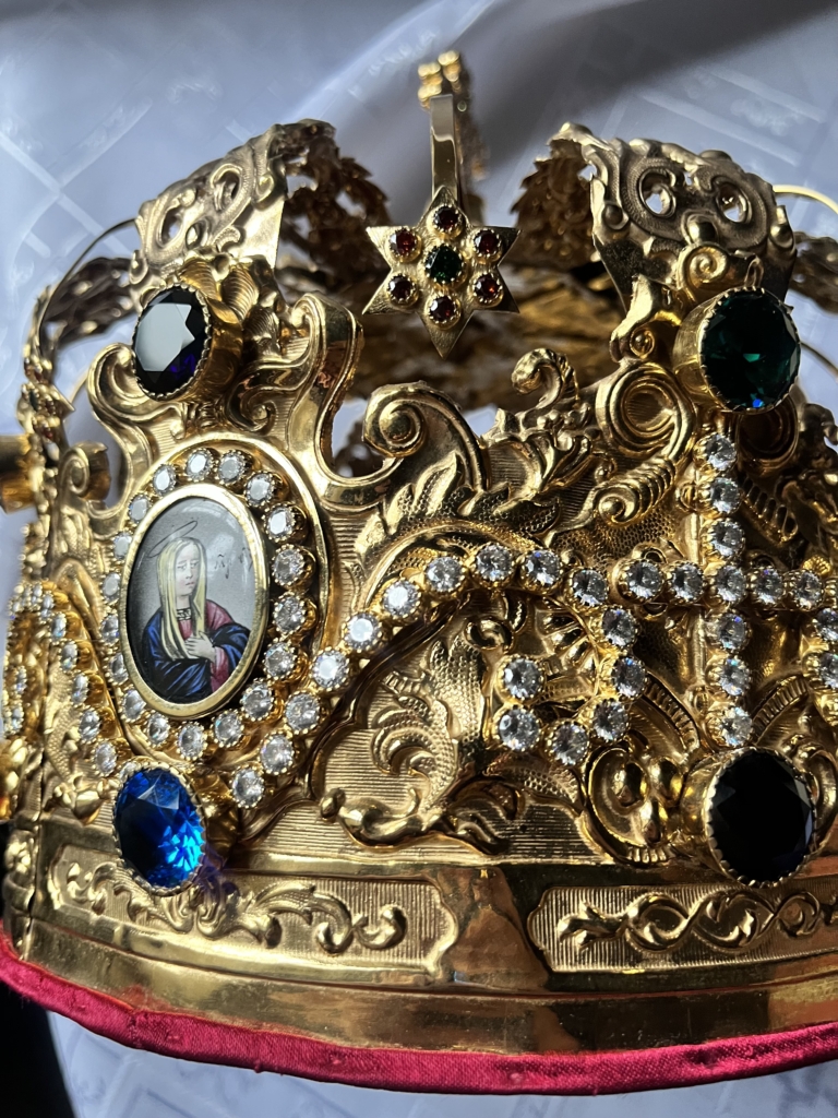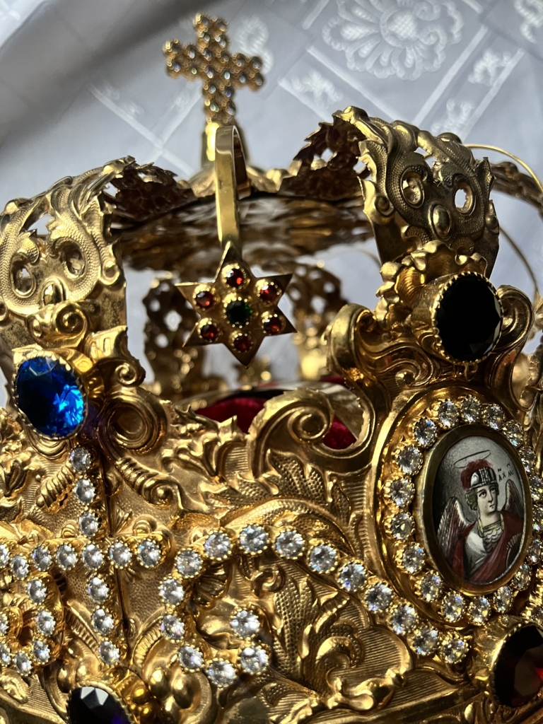 Недавно в наш храм после реставрации вернулись венчальные венцы. Им около 150 лет, многие семейные пары соприкасались с ними в Таинстве Венчания. За долгие годы венцы обветшали, многие элементы были повреждены или утрачены. Работу над венцами проводили ювелирные мастера из Костромы и длилась она более 3-х месяцев. Этот труд не простой, кропотливый, не дешёвый. Венцы были разобраны, очищены, повреждённые части исправлены, спаены, позолочены. В этой реставрации заменено около 700 камней.