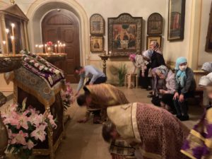 На Литургии в день праздника перед чтением отрывка из апостольских посланий поется не Трисвятое, как обычно, а тропарь «Кресту Твоему покланяемся, Владыко…» Однако это совершенно не означает, что все в этот момент должны делать земные поклоны.