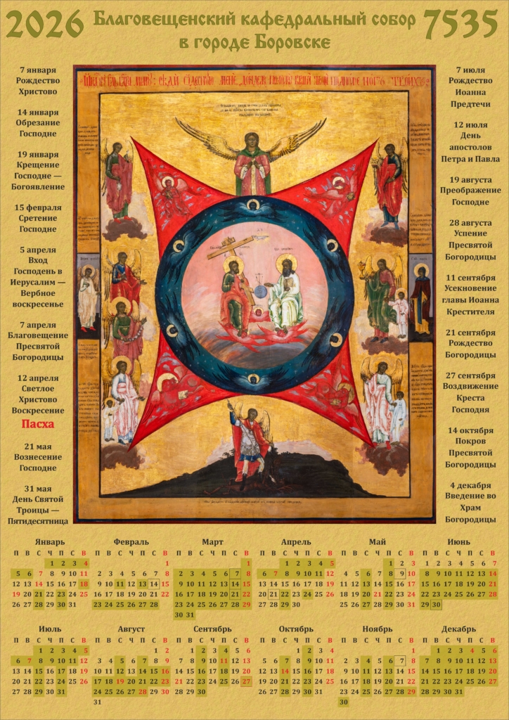 Наш храм на 2026 год издал настенный календарь. На этом календаре размещена фотография иконы из нашего храма. Эта икона в храме находится под окладом, и поэтому её не сразу узнают. Икона конца 18-го века, на верхних полях написано её название: «Рече Господь Господеви моему: седи одесную мене, дондеже положу враги твои подножие ног твоих». В центре иконы изображена изображена т.н. Новозаветная Троица, внизу архангел Михаил, вокруг другие архангелы. В проходящем году икона и риза на неё были отреставрированы.